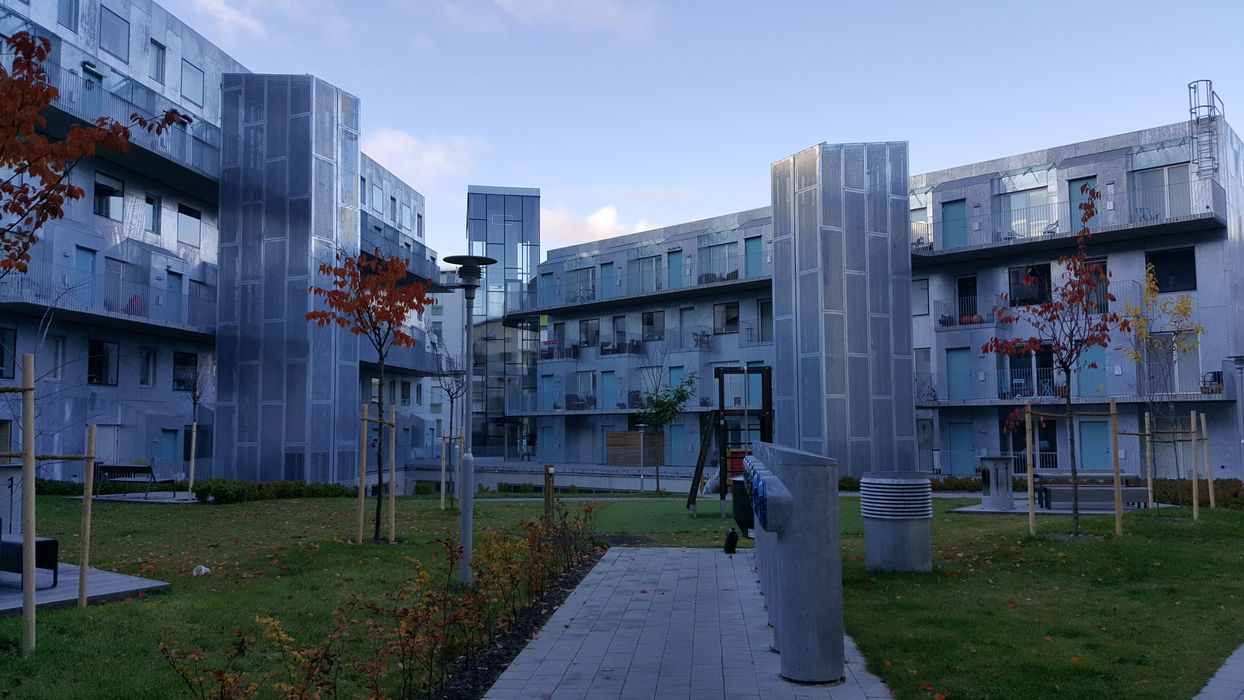 Daudzdzīvokļu ēkas fasādes apdarē Stokholmā, Zviedrijā, izmantoti metināti SIMPLEX ECG metāla paneļi, kas nodrošina vienmērīgu fasādes virsmu, augstu konstrukcijas stingrību un precīzu detaļu izpildījumu. Metinātā paneļu sistēma ļauj veidot monolītu fasādes tēlu ar minimālām šuvēm, vienlaikus saglabājot augstu mehānisko noturību un ilgmūžību Ziemeļeiropas klimatiskajos apstākļos. Izvēlētais risinājums harmoniski papildina dzīvojamās ēkas arhitektūru, nodrošinot kvalitatīvu, ilgtspējīgu un vizuāli vienotu fasādes apdari.
